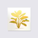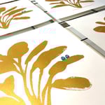This enchanting golden plant has lured two little friends up onto its shiny leaf. Hand printed with beautiful gold ink that sparkles as it catches the light.