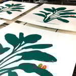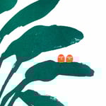 Two little blob friends have found their way up onto a nice bouncy leaf. Handmade screenprint in red and Phthalo Green.