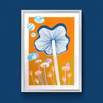 Mushrooms, bubbles and magical little characters. Limited edition screen print in orange and blue.