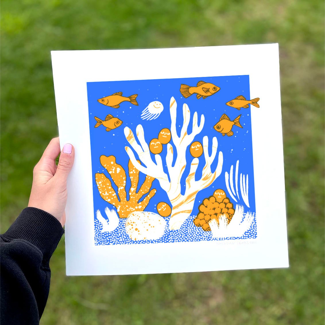 Silkscreen printing is a manual process in which layers of ink are applied to the paper by hand. Small marks or imperfections may occur as a result (but this also adds a little charm and uniqueness to each print).